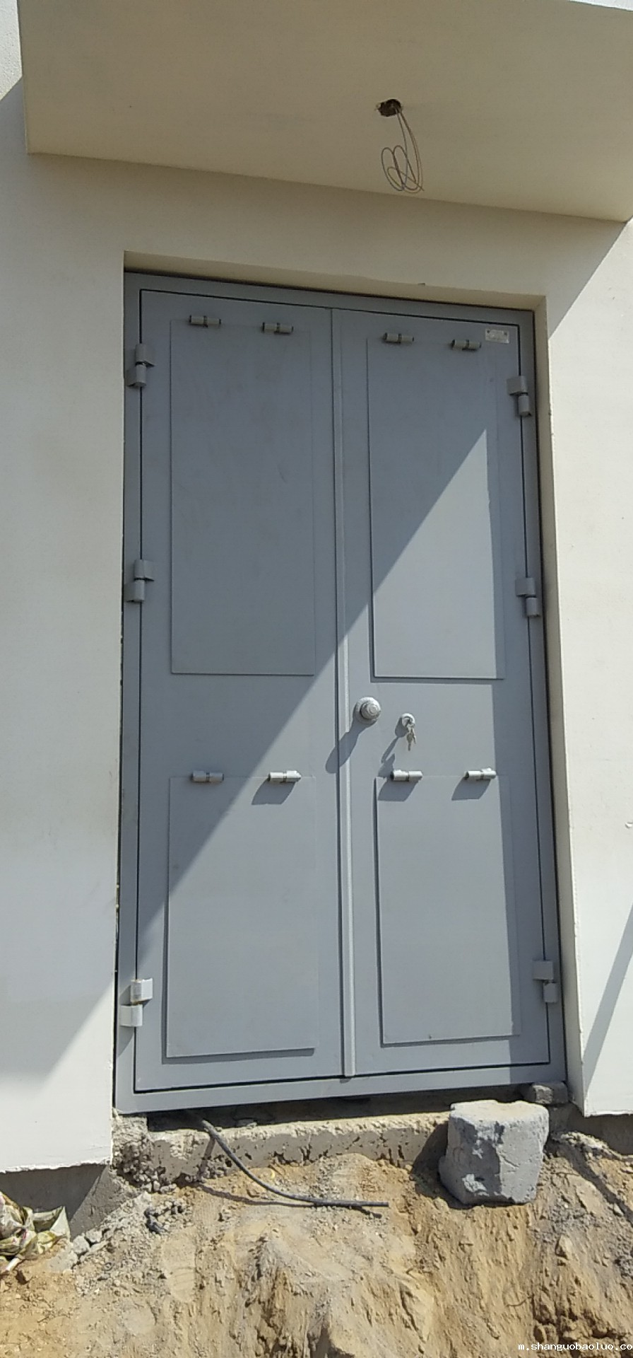 泄爆门均为外开门,门山上的泄爆窗均向外开启,泄爆窗的泄压力值是由泄爆螺栓控制的,泄爆螺栓由螺栓、防水垫圈和铝合金垫片构成。泄爆螺栓的铝合金垫片的强度是与泄爆窗的泄爆压力值相对应的。在爆炸压力作用下通过铝合金片变形,让扇窗在爆炸气流的冲击下能够开启,以达到泄爆的目的。
